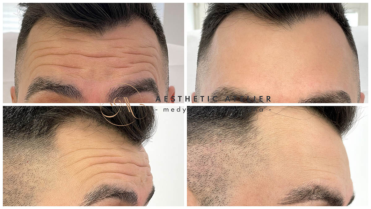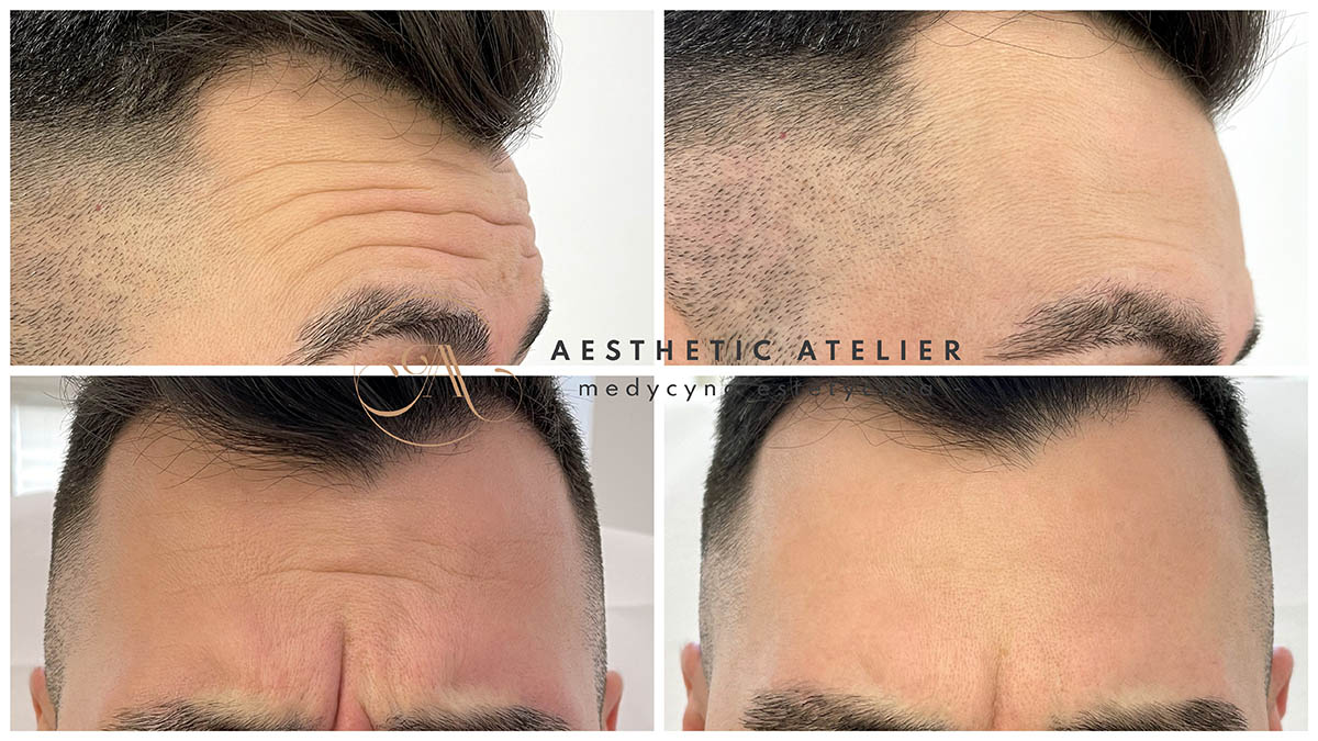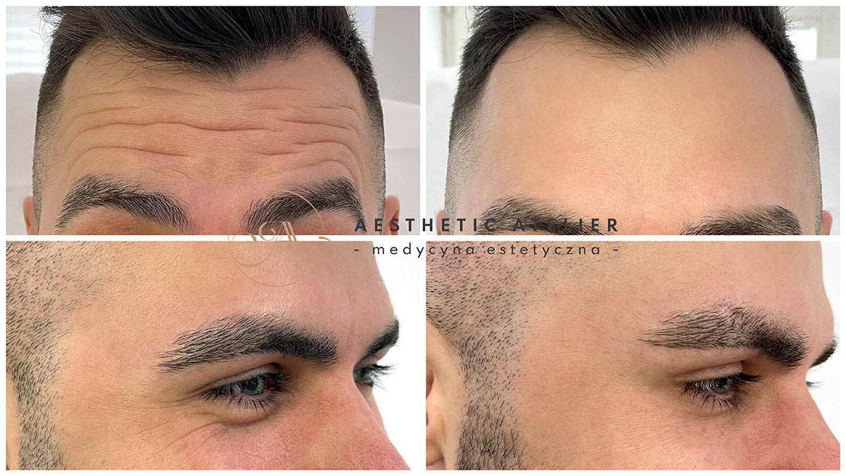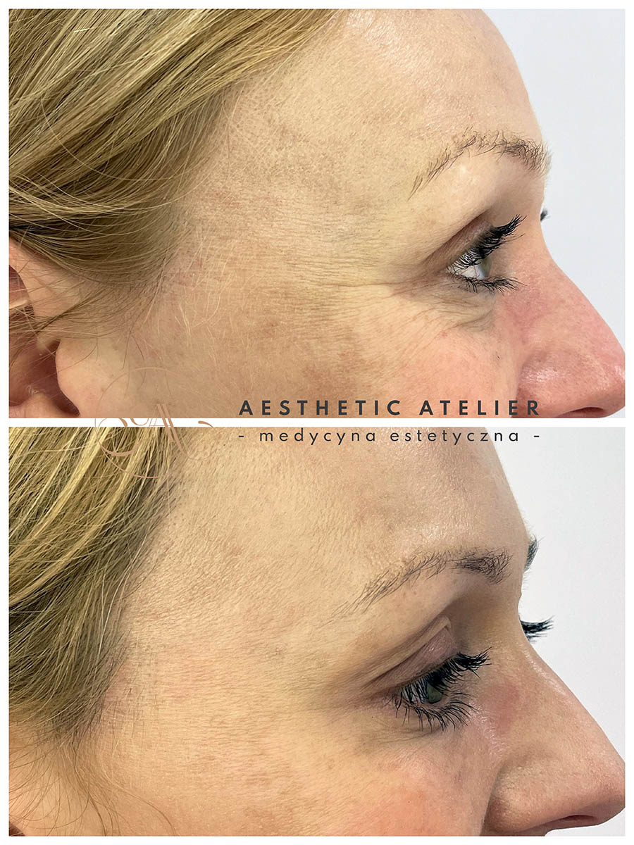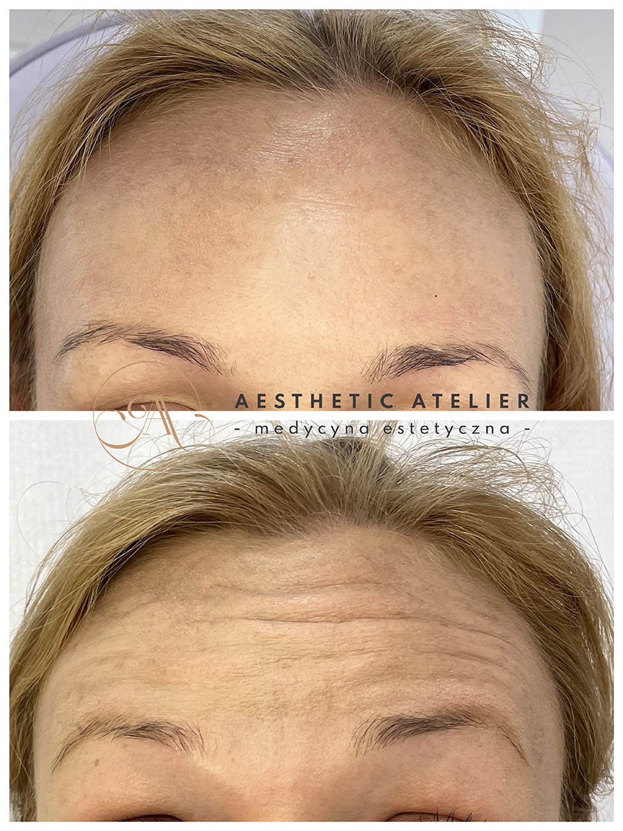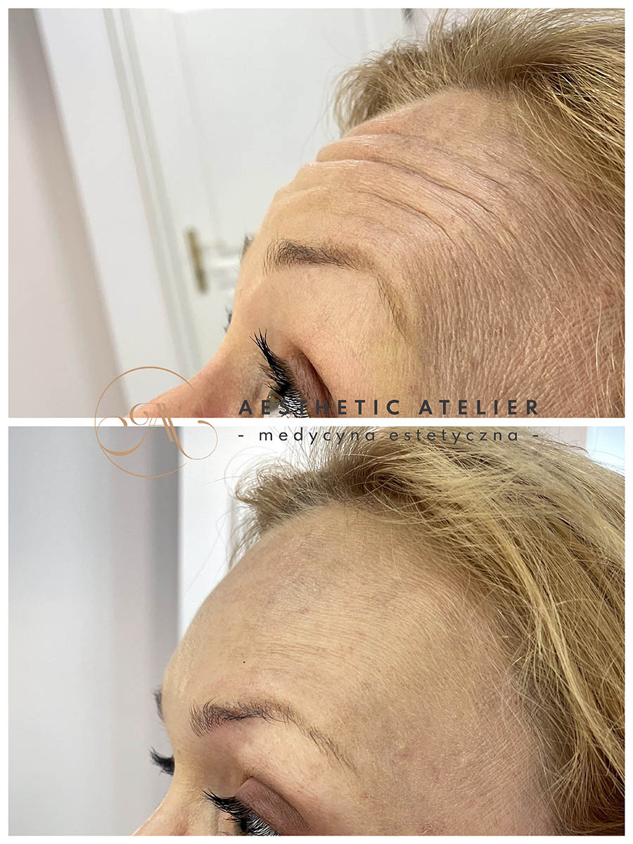 Okolice: zmarszczki poziome czoła, lwia zmarszczka, kurze łapki)